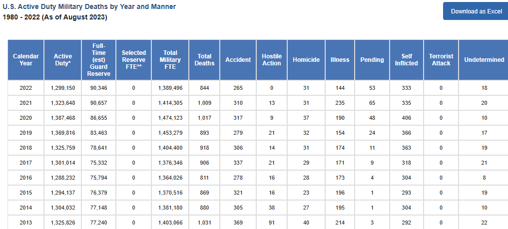 Here are the official US Military Active Duty Deaths by Manner from recent years:
